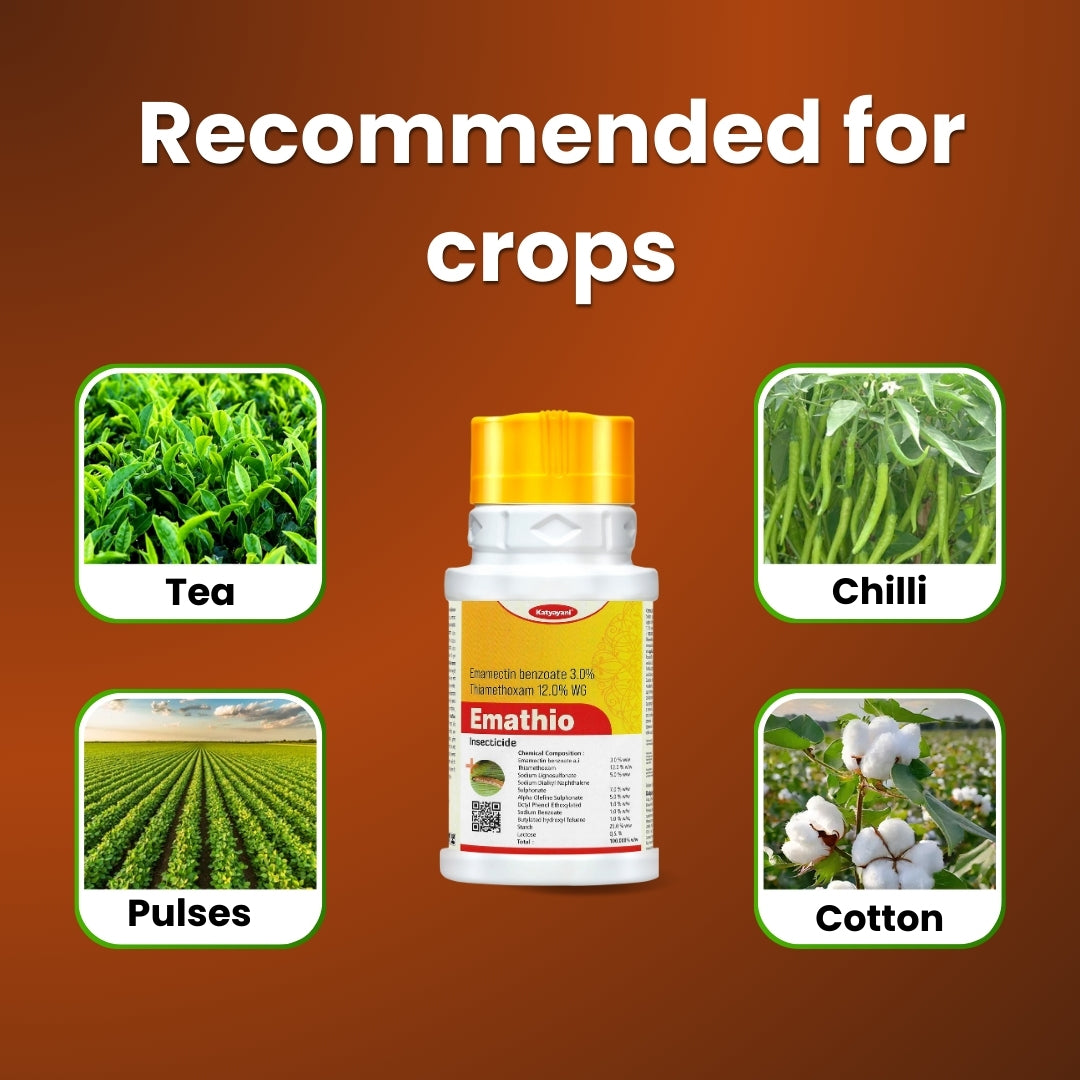 GGV Katyayani Emathio is formulated with Emamectin Benzoate 3% and Thiamethoxam 12% WG to help manage a wide range of chewing and sucking insects, supporting healthier plant growth at multiple stages. Designed for both field and garden use, it offers quick action and long-lasting protection for your crops.